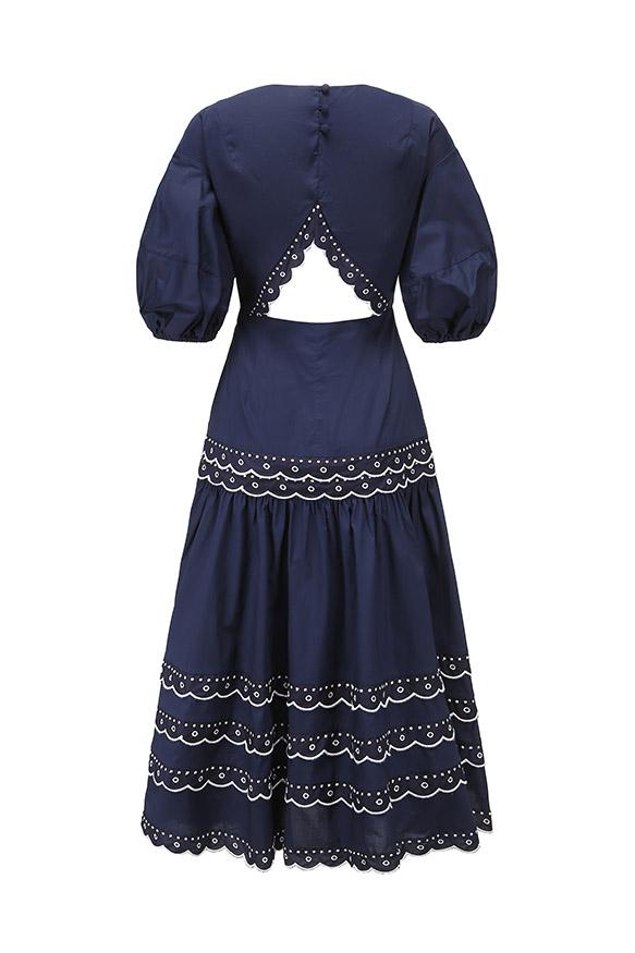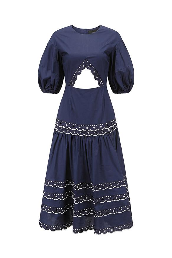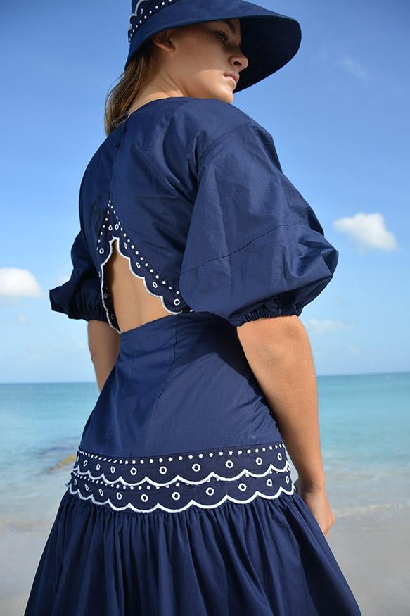 A uniquely designed statement dress with a cut out midriff. 100% cotton to keep you cool in the Summer, gentle puff sleeve and our striking midnight pearl fabric.